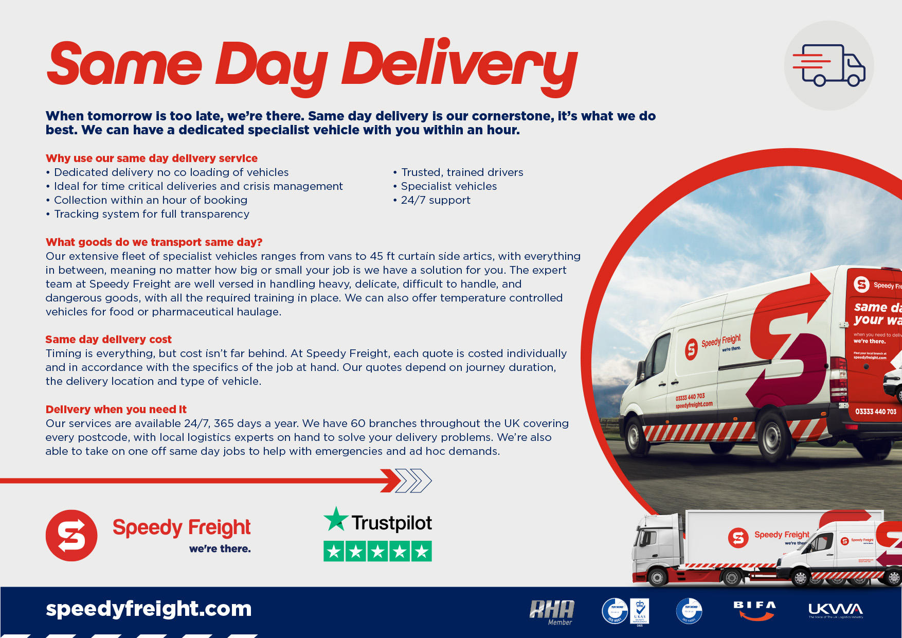 For a fast and dependable 24-hour same day courier, choose Speedy Freight. We specialise in prompt same day delivery, guaranteeing the swift and secure delivery of your goods. With us, your consignments can be picked up within 60 minutes and delivered on the same day anywhere in the UK. From express same day courier services to temperature-controlled transport and two-man delivery, we provide comprehensive round the clock logistics solutions for businesses in the Bournemouth, Bath, Southampton, and Taunton post code regions. We excel in handling urgent, time-sensitive, fragile, high-value, heavy, delicate, abnormal, and bulky loads. Contact us now to get a quote, book a delivery, or learn more about our UK & Europe transport services.